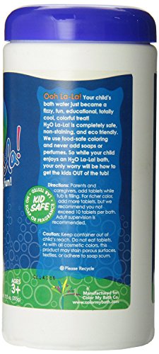 Color My Bath, LLC is proud to offer Safe, Fun, Made in America bath tablets for children-without adding oils, fragrances, or soap. Color My Bath is committed to developing products that leave both the environment and kids healthy and clean. Make bath time your child's favorite time by letting them add some 'Ohh la la.' to the bathwater. H2O La La. that is. Each jar contains 300 assorted tablets in the primary colors: red, blue and yellow??”allowing you and your child to create colors that will make your child say, 'ooh la la.' Like all of our products, the colors won't stain the tub, towels or your child - but they will last until bath time is over and they wash cleanly down the drain.