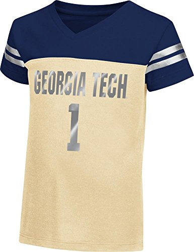 ジョージア工科大学の幼児の女の子のVネックシャツです。このジョージア工科大学のシャツは、65 %ポリエステル/ 35 %レーヨンデュアルブレンドでさらに快適に、究極の柔らかさを提供します。あなたの小さな黄色のジャケットプリンセスを利用したスーパースター、シルバー箔ロゴがフロントにデザイン。ストライプの新しいシルバー箔を使用して設計された袖も上にスクリーン印刷。このシャツは洗濯機、のでアクティブな幼児にぴったりです。心を表示でき、さらにあなたのリトルイエロージャケットチアリーダーましう!GOジャケット。