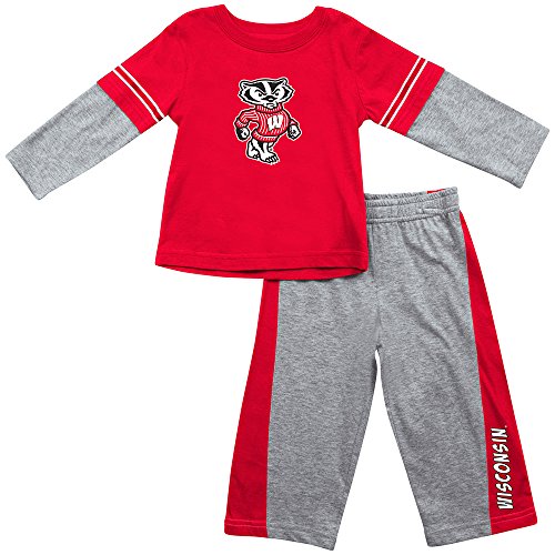 あなたの小さなスポーツがゲーム使用準備この千と千尋のウィスコンシンアナグマは設定されていませんこの100%綿ニットセットは、両方のスタイルと快適。層状の袖シャツにスクリーンプリントのウィスコンシンのロゴとゴムウエストのズボンとのチーム名ダウンはありません。
