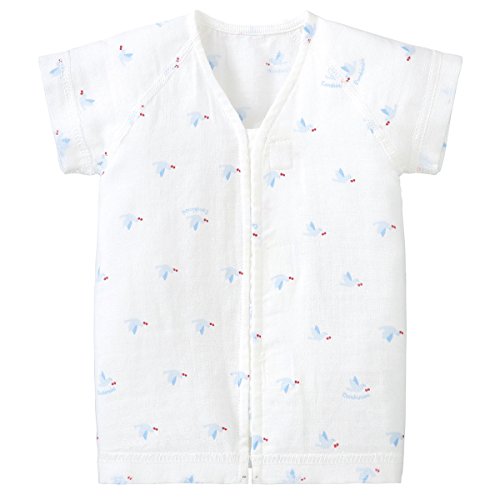 ぱっと開いてさっと閉じて着脱簡単。お着替えがラクにできるワンタッチテープ式。ガーゼ素材で吸汗性満点。青い鳥が赤ちゃんとのハッピーな毎日にぴったりです。男女兼用タイプ。