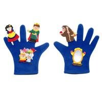 指人形専用のグローブ。面ファスナーが貼り付くようになっています。手にはめて動きをつけながらお話を展開できるから、よりダイナミックに人形劇が楽しめます。青色のグローブと指人形の「ピノキオ」をセットで。
