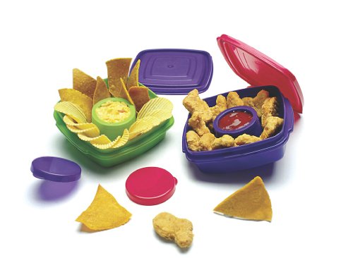All in one container for your favorite snack and dips, Hermetic seal to keep liquids in, Microwave re-heatable and dishwasher safe, Available in multiple colors