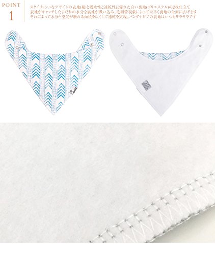 ●スタイリッシュなデザインの表地(綿)と吸水性と速乾性に優れた白い裏地(ポリエステル)の2枚仕立て。 表地がキャッチしたよだれの水分を裏地が吸い込み、毛細管現象によって素早く裏地の全面に広げます。それによって水分と空気が触れる面積を広くして速乾を実現。バンダナビブの裏地はいつもサラサラです。