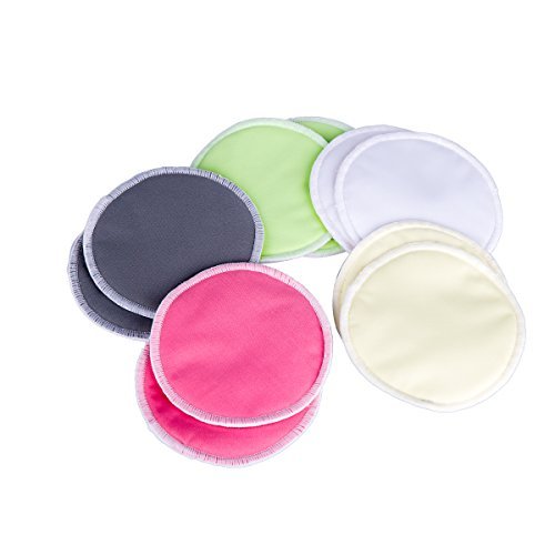 Organic reusable bamboo nursing pads provide quality leak-proof comfort.;Designed to provide premium comfort and confidence for the breast feeding, pumping, or expectant mother, during this special time for baby and mom. The outside layer is also water-proof.;One size fits most, at approximately 4.5 inches in diameter.;10 Pack (5 pair) of white, light yellow, light green, pink and grey nursing pads. And they are made of breathable organic sustainably harvested bamboo which is ecologically friendly and washable, making our pads the best for mom, baby and the planet.;Reusable after each breast feeding and machine washable. Very durable. Gets softer and softer after each wash.
