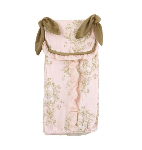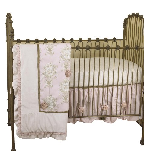 Lollipops and roses 7 piece set contains dust ruffle, crib sheet, coverlet, diaper stacker, toy bag, pillow pack, and valance;Soft pink and cream toile set with flower accents;Machine wash cold water, gentle cycle, tumble dry low