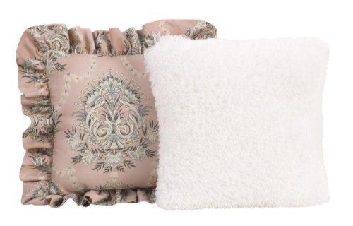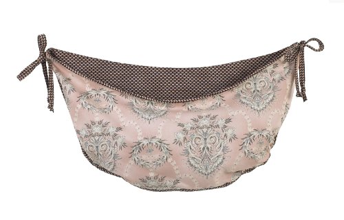 8 piece set includes bumper, dust ruffle, crib sheet, coverlet, diaper stacker, toy bag, valance, and pillow pack;Soft pinks and charcoals;Machine wash cold water, gentle cycle, separate, tumble dry low