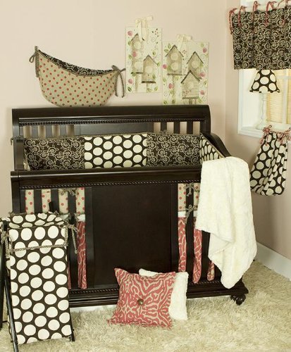 A quality baby bedding set is essential in making your nursery warm and inviting. All cotton tale patterns are made using the finest quality materials and are uniquely designed to create an elegant and sophisticated nursery. Wonderful color texture in cream, chocolate, and bright raspberry dot. The raspberry dot 7 piece set includes 3 piece crib bedding(dust ruffle, crib sheet, coverlet), diaper stacker, toy bag, valance, pillow pack. Sheet in soft minky. Bed skirt in raspberry stylized animal print. Coverlet in faux rabbit skin with minky back. Big, big dots in chocolate and cream make the raspberry dot diaper stacker. It holds up to 6 dozen newborn diapers. 100% prewashed cotton with raspberry dot trim. Two pillows make up this fun pack. One in raspberry animal print, the other in faux rabbit fur. Measuring 14x14 and 8x8. Sold as a pack and specifically for decorative purpose only, never in the crib. Spot clean only. Combination of cotton and polyester with poly fill. . The raspberry dot toy bag is the perfect accessory for your nursery. This toy bag can be hung on the wall for decoration or on the changer to hold supplies. Made in raspberry dot fabric and lined with chocolate and ivory vine fabric. The raspberry dot valance is chocolate vine with raspberry ties to attach to a decorative rod. Valance measures 55 x 16. Machine wash cold water, gentle cycle, separately. Tumble dry low or hang to dry. A great, fun set for our baby girl's nursery. Wash gentle cycle, separate, cold water. Tumble dry low or hang dry.
