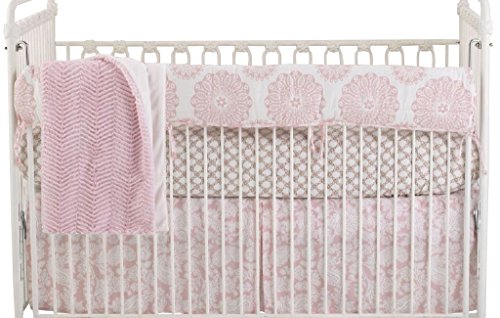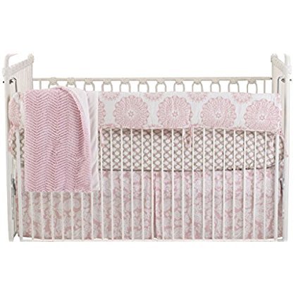 A quality baby bedding set is essential in making your nursery warm and inviting. All Cotton Tale patterns are made using the finest quality materials and are uniquely designed to create an elegant and sophisticated nursery. Sweet and Simple Pink is a beautiful combination of soft colors and beautiful patterns. All fabrics in 100% cotton percale. This set includes a rail cover instead of a traditional bumper. Along with the medallion front rail cover also included in this set is the Graphic daisy sheet, a tailored bed skirt 15 inches deep with front pleat in floral paisley, and coverlet in a pink chevron cuddle, lined in white minky is what is included in this front cover up set. This beautiful pattern is sophisticated but soft and inviting. A perfect touch for your little girls nursery. The addition of the rail cover to the 3pc set makes a beautiful enhancement for the bumper less crib, not only adding color and pattern but protecting the crib as well. Machine wash, cold water, delicate cycle, separate. Tumble dry low. Made in the USA.