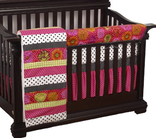 This set includes crib sheet, coverlet, dust ruffle, and front cover up;Bold colors, polka dots and florals;Machine wash cold water, gentle cycle, separate, tumble dry low