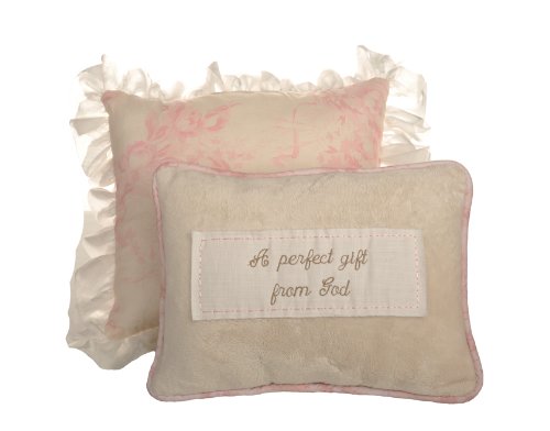 A quality baby bedding set is essential in making your nursery warm and inviting. All Cotton Tale patterns are made using quality materials and are uniquely designed to create your perfect nursery. Part of the Heaven Sent Girl collection is the pillow pack, two pillows one embroidered with A Perfect Gift from God and one ruffled in sheer fabric. Perfect for decorative accents but never in the crib.