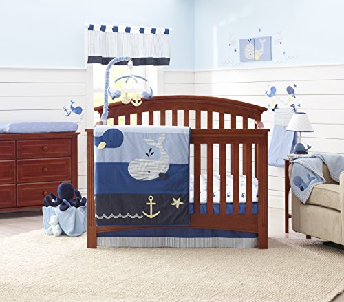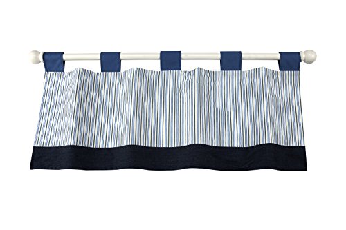 A whale of a tale in adventures awaits on the high seas. Detailed applique accents and a blend of mini prints and stripes in shades of classic blues, white and a touch of soft yellow complete this classic Nautica collection.;Tab Top style valance, with a blend of stripes and solids Colors are navy, white, yellow, light blue and bright blue with solid blue border and tabs Measures 14 x 60.