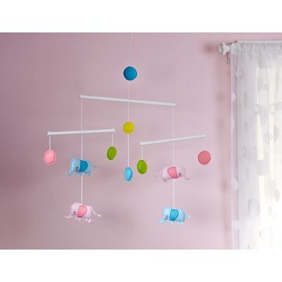 Comes ready to hang from ceiling;Felt characters, colorful elephants and circle shapes. Pink, aqua, turquoise, yellow and green;Surface Clean Only;Coordinates sold separately: Traditional Padded Bumper and 2 Pack Sheet Set