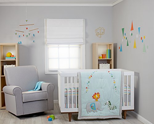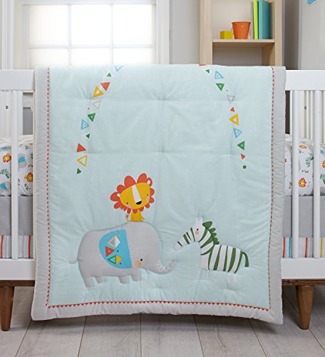 Comforter, 2 Crib Sheets (stripe and character print), Dust Ruffle and Wire Wall Decor. Wire art measures 10 x 9.7;Featured Fabrics are 55% cotton 45% polyester 180 TC. Color are Soft aqua, pearl grey, pops of marigold, orange, turquoise and green.;Machine wash separately in cold water, gentle cycle. Use only non-chlorine bleach when needed. Tumble dry on low heat. Iron on low heat when needed. Do not dry clean.