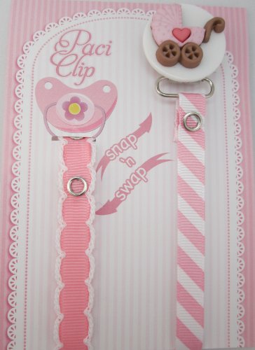 Ribbon Pacifier Clip, attaches to all Pacifier, Mam adopters available;Rust Free Clip, Never loose a Pacifier again, save your childs clip from Germs and dirt;2 Matching adorable interchangeable ribbons, wash 'em, snap 'em, swap 'em;Never Leave your child un-attended or placed to sleep while wearing clip, buyer assumes full responsibility;Quickley fastens to baby's clothing, for all ages, Smart Design enables one hand use