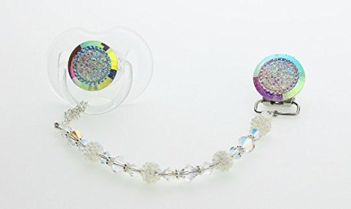 Pacifier available - SOLD SEPARATELY!;Get the bling without the cha-ching - Makes for a perfect baby shower gift.;Pacifier Clip - Perfect for weddings, communion, baptism, christening, bris;Made in USA - Hand assembled in Brooklyn, NY, Comes in a box ready to gift;Lab Tested, Lead and phthalates Free, Approved by CPSIA