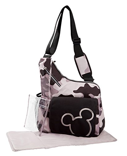 Fully lined interior easily wipes clean. Includes Changing Pad, and Clear Accessory Pouch;This Messenger Style Diaper Bag has a Small front Mickey Flap, Exterior Side Mesh Pocket.;Small front Zip Pocket, and an Elastic Back Pocket