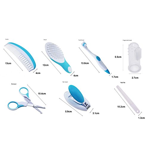 - 7点セット:指先歯ブラシ、歯ブラシ、ヘアブラシ、くし、ミニネイルファイル、ネイルはさみ、ネイルクリッパー。