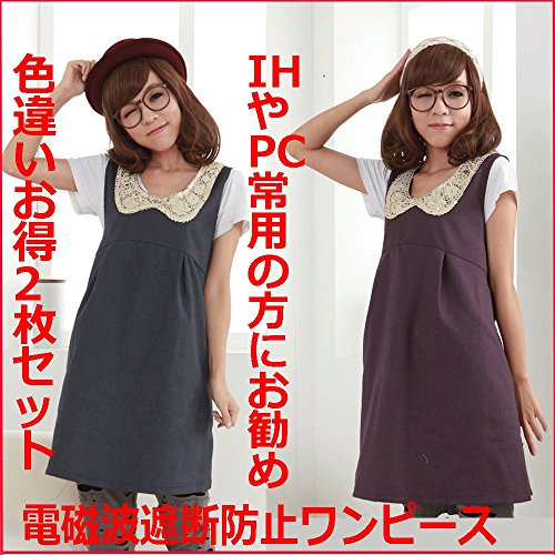 ★金属アレルギー対応★ 電磁波防止ワンピース 電磁波を前後左右から99.9%カット 可愛いスパンコール付き電磁波ワンピース パープル&ネイビーブルー色 電磁波 電磁波防止 エプロン マタニティウェア 妊婦服 色違い お得2枚セット