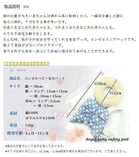 頭の比重が大きい赤ちゃんは頭から床に転倒したり、一瞬目を離した隙に後ろに倒れ、ケガをする事が多いです。お座りをはじめた赤ちゃんも、つかまり立ちをはじめた赤ちゃんも、とても不安定な動きをします。そんな時、我が子の安全を守ってくれる安全グッズ、エンゼルリングパッドです。 軽くて負担が少ないプロテクターで、家でも外でも安全・安心して自由に遊ばせてあげることができます。