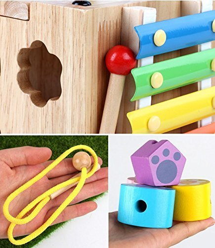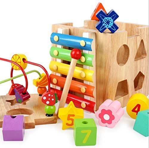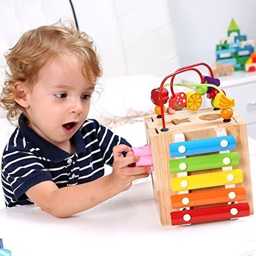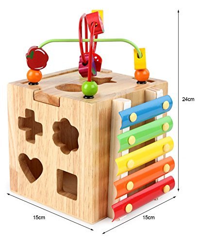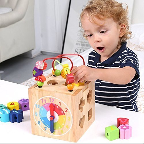 - ビーズ迷路玩具:9.5x5.9x5.9インチの木製立方体に曲がりくねったワイヤーライド、学習時計、スピンとマッチの動物、回転してabcの単語タイル、そろばんとビードロールの迷路が含まれています。
