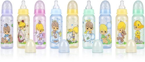 Precious Moments Baby Bottles.;These baby bottles are made from clear, break-resistant plastic.;The opening of the medium flow nipple design is perfect for milk.;The nipples feature nubs that assist in the eruption of teeth.;Colors of these baby bottles include Purple, Yellow, Pink, Blue, and Green.