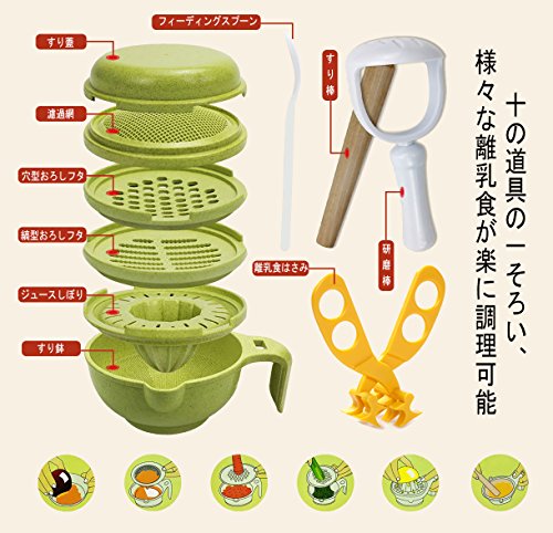 - [セット内容·付属品]:すり蓋 、濾過網、穴型おろしフタ、縞型おろしフタ、ジュースしぼり、すり鉢、離乳食はさみ、研磨棒、すり棒、フィーディングスプーン 各1