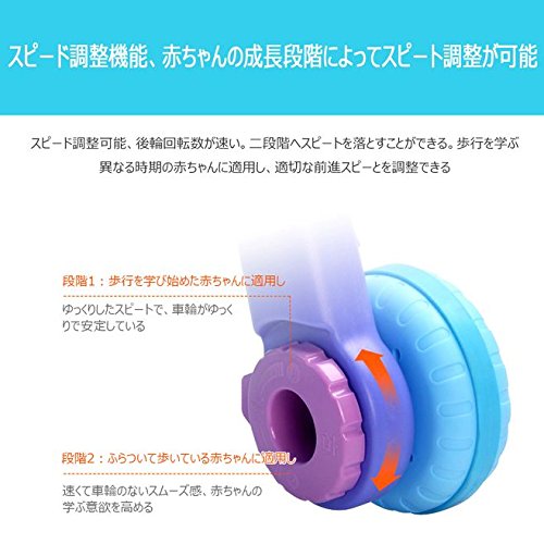 - スピード調整可能、後輪回転数が速い。二段階へスピートを落とすことができる。歩行を学ぶ異なる時期の赤ちゃんに適用し、適切な前進スピーとを調整できる