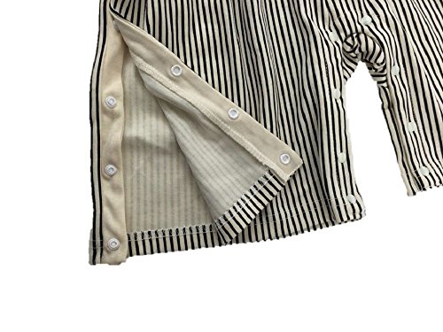 - 右肩の部分から脇を通って右足裾の部分まで及び内股部分に掛けてスナップボタンで脱着可能となっており、寝かせたままのお着替えは勿論、おむつの交換も簡単に出来ます。