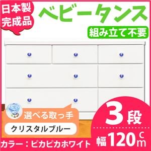 取っ手が選べるローチェスト/タンス 120cm幅 3段(本体:ピカピカホワイト 取っ手:クリスタルブルー×全9個) 〔日本製〕〔完成品〕