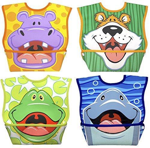 For ages 6-24 months, Patented "Catch-All" pocket prevents messes, Waterproof outer layer, Lifetime Warranty, Includes 1 each of all 4 images (Hippo, Tiger, Frog, Dolphin)