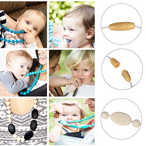 The beads are made from 100% food grade silicone. Soft non-toxic material - No BPA, no phthalates, no cadmium, no lead or heavy metals. FDA and CE approved. A good alternative to freezer teething rings, baltic amber beads, pacifiers, teether or chew keys.And the necklace comes with a break away clasp for added safety so there is no risk of runaway beads.