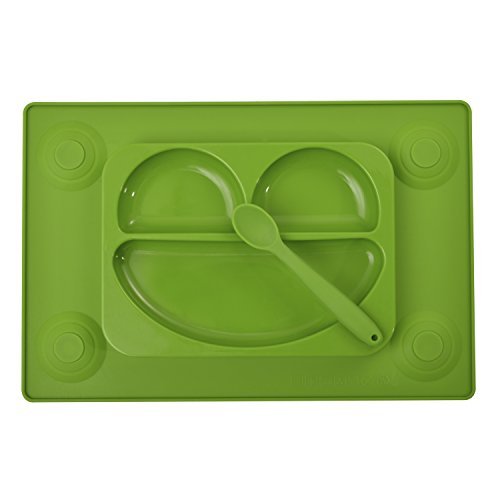DOMIRE Happy Face Feeding Set EasyMat Kids Placemat No Mess Divided Suction Plate. Safety Food Grade Silicone Non-slip Suction Bowl Sectional Baby Plate. (Green) by Domire