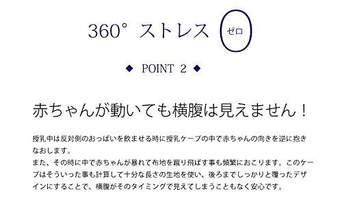 赤ちゃんは成長していくにつれ、手足をよく動かすようになるので、授乳中も遊びながら飲んだり、飲む前に少し泣いてバタバタすることがとっても多いんですよ。 また授乳中は左右交互に飲ませるので、赤ちゃんの向きを入れ替える事になります。その時に布地に余裕がないと見える心配がありますが、この授乳ケープは360°カバーしているのでその心配もありません。また、布地が広いので赤ちゃんの方向転換も楽々で安心です。 ■サイズ 着丈65.0cm ■気になる横や後ろから見えやすい腰回りも充分に隠せる形状で授乳中に動く赤ちゃんでも安心です。 ■コンパクトで安全ワイヤーが入ってなくても、赤ちゃんの様子はよく見えます。 ■ベビーカーで寝んねの時はブランケットとして ■袖の部分はボタンで止めると半袖スタイルに。