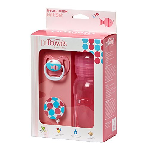 This Special Edition Pink Soothers Gift Set, offers a pink coloured Dr Brown's Natural Flow Baby Bottle, plus Prevent Soother and Clip. Soother (0-6 months) has a patented Suction-Free Air Channel;Contents: 1 x 240ml Wide Beck baby bottle, 1 x Level-One Silicone teat, 1 x Two-piece internal vent system;1 x Cleaning brush;1 x PreVent Stage 1 soother, 0-6 months;1 xo Soother Clip