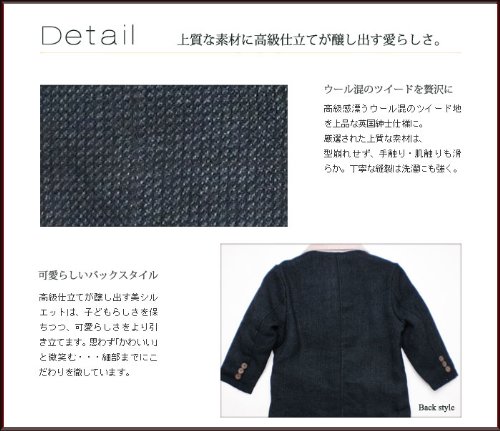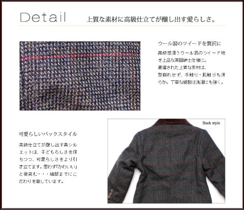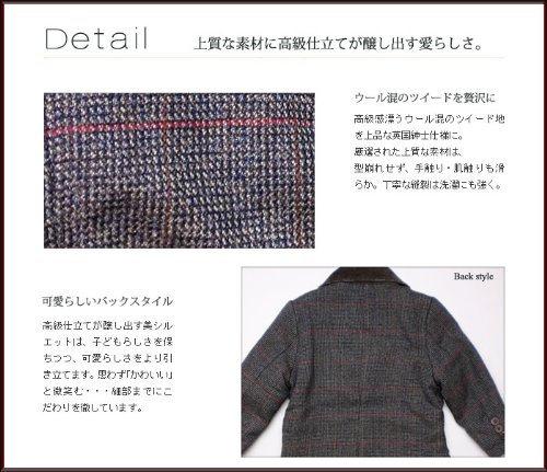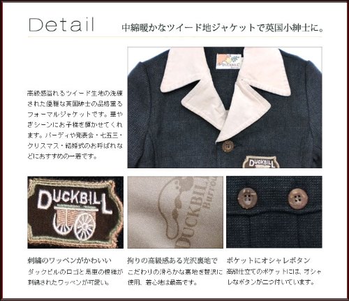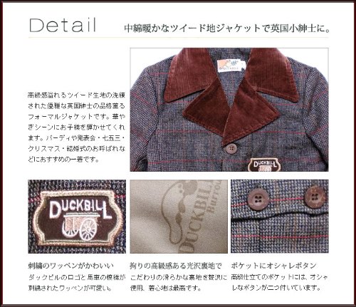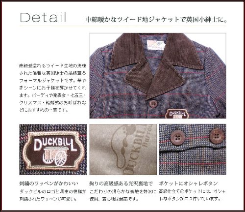 大人顔負けデザインのツイードジャケットです。襟の部分がコーデュロイになっているのがお上品さアップのポイント。オシャレな3ボタンタイプで、ちょっとしたフォーマルからお出かけ着にまで幅広くお召しいただけます。裏地はカモノハシ君がいっぱいのサテン生地。中綿も入ってポカポカ暖か!ポケットはフタ付きのボックスポケットで、オシャレに留めボタンが2つ付いています♪※ボタンに傷のような模様がありますが、これはデザイン上のものです。表地:コットン50%+ポリエステル50% 裏地:ポリエステル100%