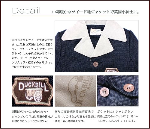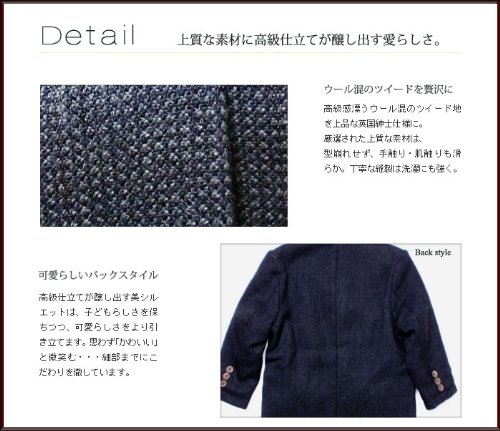 大人顔負けデザインのツイードジャケットです。襟の部分がコーデュロイになっているのがお上品さアップのポイント。オシャレな3ボタンタイプで、ちょっとしたフォーマルからお出かけ着にまで幅広くお召しいただけます。裏地はカモノハシ君がいっぱいのサテン生地。中綿も入ってポカポカ暖か!ポケットはフタ付きのボックスポケットで、オシャレに留めボタンが2つ付いています♪※ボタンに傷のような模様がありますが、これはデザイン上のものです。表地:コットン50%+ポリエステル50% 裏地:ポリエステル100%