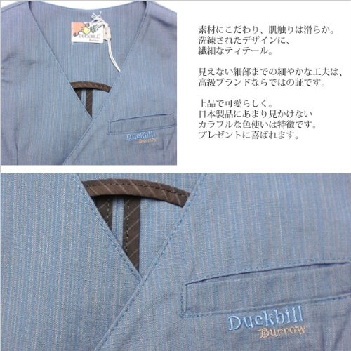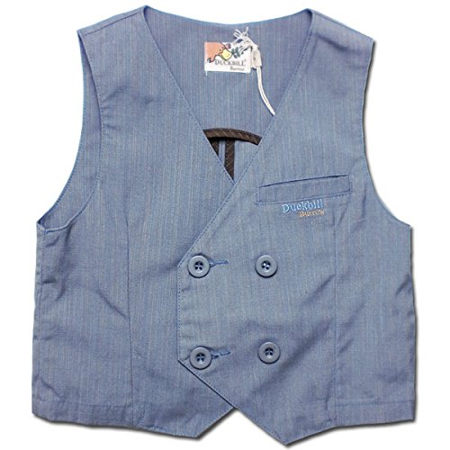 細いストライプ柄が可愛い正統派フォーマルタキシード(ベスト)です。ボタンなど、全体を同色でまとめ、ワンポイントで胸元のポケットにDuckbillの上品な刺繍があしらわれています。着るだけで小さな紳士のできあがりです♪背中はベルト風アレンジや緩やかな湾曲を描く切り替えしで、大人顔負け!内側の端処理も切りっぱなしではなく、違う生地で覆われており、ブランドのこだわりが細部まで感じられる仕上がりになっております。素材:コットン95%+スパンデックス5%。春夏秋物。