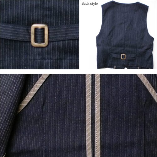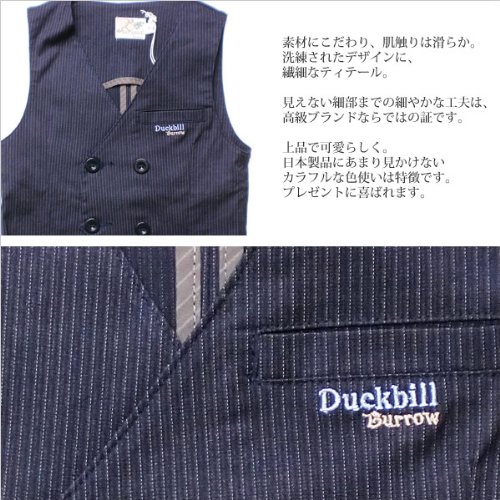 細いストライプ柄が可愛い正統派フォーマルタキシード(ベスト)です。ボタンなど、全体を同色でまとめ、ワンポイントで胸元のポケットにDuckbillの上品な刺繍があしらわれています。着るだけで小さな紳士のできあがりです♪背中はベルト風アレンジや緩やかな湾曲を描く切り替えしで、大人顔負け!内側の端処理も切りっぱなしではなく、違う生地で覆われており、ブランドのこだわりが細部まで感じられる仕上がりになっております。素材:コットン95%+スパンデックス5%。春夏秋物。
