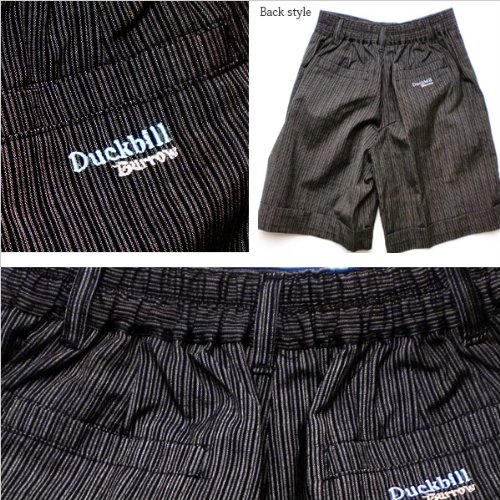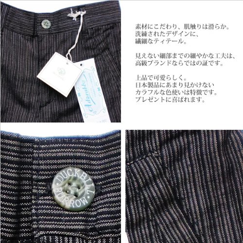 細いストライプ柄がフォーマルな雰囲気を漂わせるパンツです。Tシャツと合わせてカジュアルに、シックなシャツと合わせて紳士風に…着こなし次第でどんなスタイルにもばっちり合わせる事ができる優れものです!ポケットは前後2つずつ、合計4つついています。後ろのポケットにあしらわれたDuckbillの刺繍がフォーマルなお上品さを引き立たせます。ウエストは半ゴムなので着脱も楽々♪素材:コットン95%+スパンデックス5%。春夏秋物。