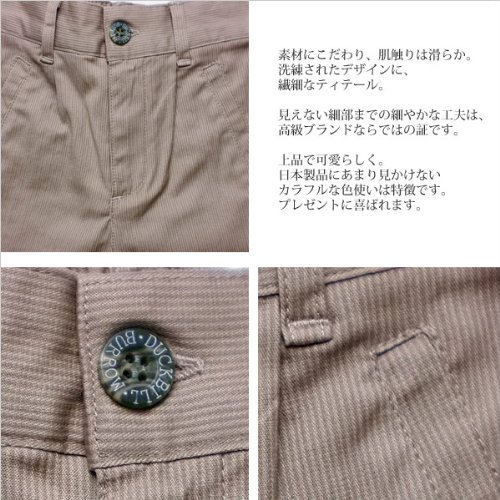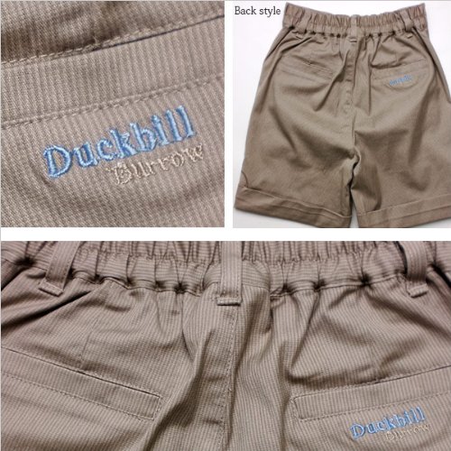 細いストライプ柄がフォーマルな雰囲気を漂わせるショートパンツです。Tシャツと合わせてカジュアルに、シックなシャツと合わせて紳士風に…着こなし次第でどんなスタイルにもばっちり合わせる事ができる優れものです!ポケットは前後2つずつ、合計4つついています。後ろのポケットにあしらわれたDuckbillの刺繍がフォーマルなお上品さを引き立たせます。ウエストは半ゴムなので着脱も楽々♪素材:コットン95%+スパンデックス5%。春夏秋物。