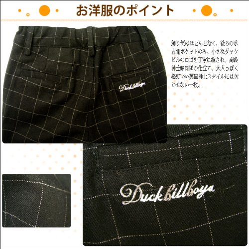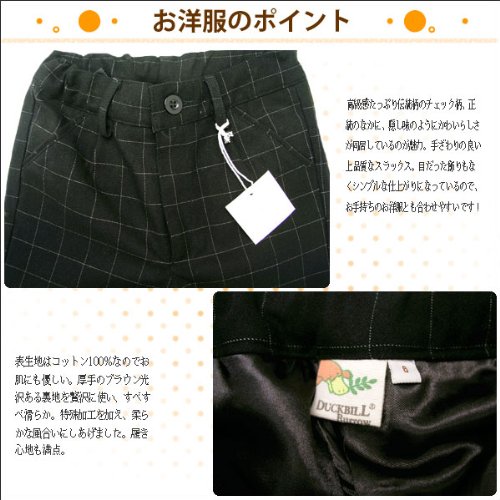 チェック柄が可愛い正統派フォーマルタキシードです。冠婚葬祭にも恥ずかしくない機能性豊かなおしゃれなフォーマルという事でダックビルからの登場です。ツータックのタキシードパンツ。両サイドのポケットと後ろの左右に玉縁ポケット。ため息が出るくらいおとな顔負けのこのフォーマル。これさえあればこれからの卒園卒業、入園入学、 結婚式のお呼ばれにも使えそうです。きっと他の誰よりも輝いて、凛々しく見えることまちがいなし。 表地:コットン(綿)100%で、裏地ポリエステル100%。秋冬物。