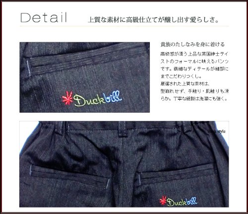 薄めで柔らかく、通気性の良い夏生地のパンツです。生地に地模様が入っていて高級感のあるオシャレを演出。縫い糸やボタンも同系色でまとめられていてシックな雰囲気です。いつもよりちょっとオシャにレしたいときはモチロン、お行事の時にフォーマル着としてお召しいただいても何の遜色もないくらいです!お尻にさり気なく入ったダックビルのロゴも大人っぽくてオシャレ!フェイクポケットもついています。夏にフォーマル着を着ると汗ばんじゃうけど、このパンツなら涼しくお召しいただけると思います。素材:コットン55%+ポリエステル45%
