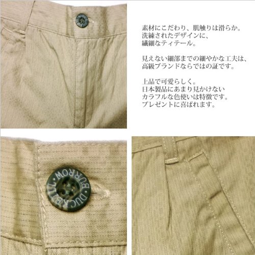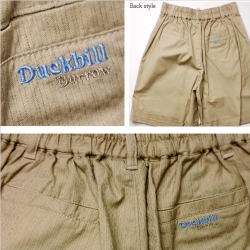 シックなブラックの生地に細めのストライプ模様が入った少しフォーマルテイストのショートパンツです。折り返し裾のデザインになっていて、ちょっとしたお出かけにピッタリの一枚。ウエストは半ゴムで伸縮があり、履きやすいパンツに仕上がっています。ポケットは前後2つずつ、合計4つついています。。後ろのポケットには「Duckbill」ブランドのロゴ刺繍が施してあります。(ポケット口が高級仕立ての仮止めしてありますので、ご着用の前にお切り下さいませ) 春夏物。素材:コットン95%+スパンデックス5%。春夏秋物。