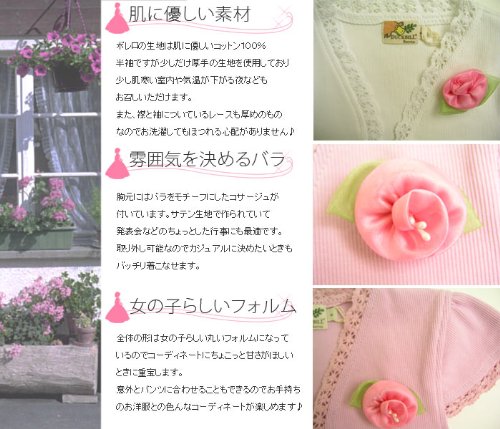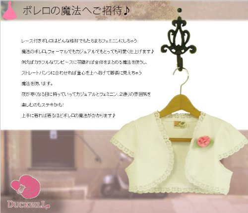 レース付きボレロはどんな格好でもたちまちフェミニンにしちゃう魔法のボレロ。フォーマルでもカジュアルでもとっても可愛く仕上げます♪ 例えばカラフルなワンピースに羽織れば全体をまとめる魔法を使うし、ストレートパンツに合わせれば重心を上へあげて脚長に見えちゃう魔法を使います。夜が寒くなる日に持っていってカジュアルとフェミニン、2通りの雰囲気を楽しむのもステキかも!上手に着れば着るほどボレロの魔法がかかります♪オススメ季節:秋、春、夏 / 素材:コットン100%です。