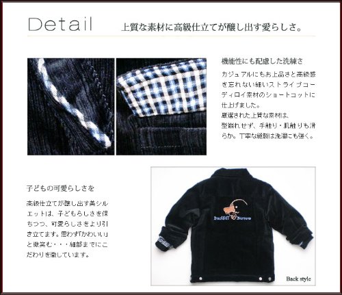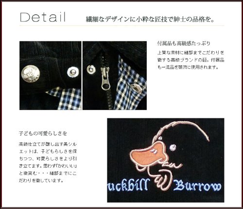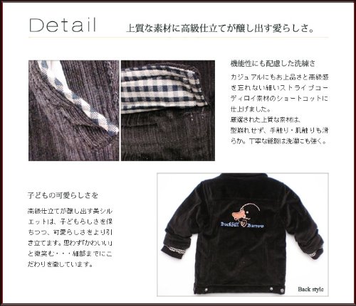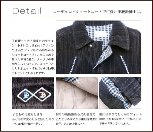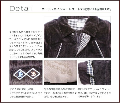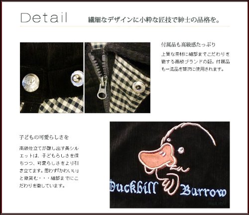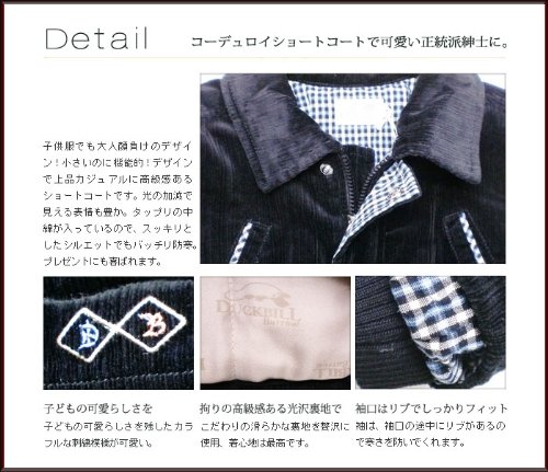 小さいのに機能的!冬にピッタリのコーデュロイショートコートです。細かいストライプのコーデュロイは高級感があり、光の加減で見える表情も豊か!ジャケットの裏地は可愛いカモノハシ君の生地とチェックの生地の組み合わせ。タップリの中綿が入っているので暖かさバツグンです!袖は、袖口の途中にリブがあるので寒さを防いでくれます。前空きはファスナーとボタンのダブルブロック。襟にも綿が入っています♪背中に刺繍されたシンプルなカモノハシ君も可愛いですよv表地:コットン100% 裏地:ポリエステル100% トリム:ポリエステル100%