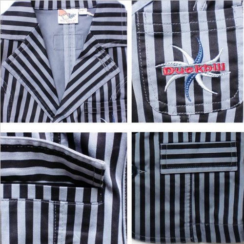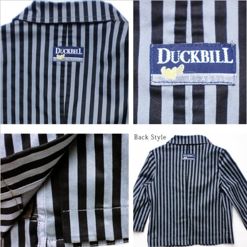 モダンなストライプ模様が格好よい薄手のテーラードジャケットです。前は4つボタンのスタイリッシュなシルエット。胸ポケットの刺繍が格好よいです!ポケットは他に蓋つきのものが二つ。機能性もしっかりとしています。背中の襟下にはダックビルのロゴ入りのタグが付いています♪※左襟の未開口のボタンホールがありますが、これはデザイン上のものです。素材:コットン95%+スパンデックス5%