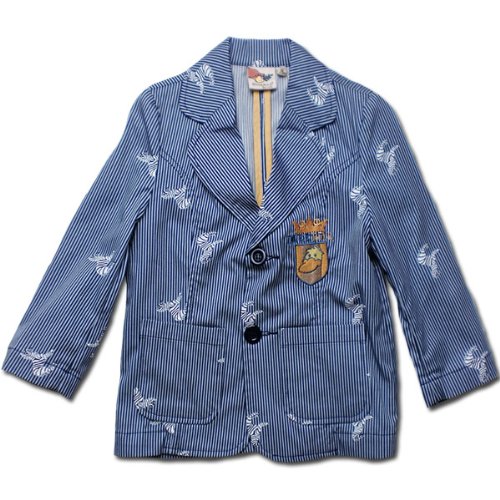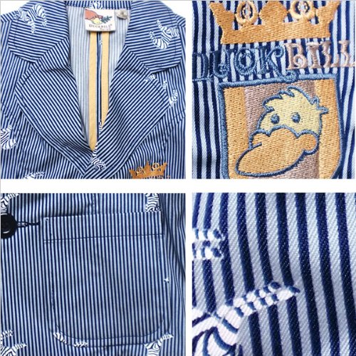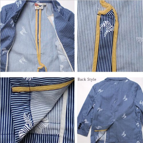 形はシンプルでも生地やデザインに拘ったオシャレなジャケットです。かたくなりがちなジャケットですが、襟の角を丸くすることで少し柔らかな印象に。生地はカラフル、太さと違うストライプを合わせた柄と、細めのストライプにシマウマのイラストが溶け込んだ個性的な柄の2展開。前は2つボタンでちょっぴり大人テイスト。しっかりポケットも付いて、胸元には校章風のカモノハシ君の刺繍入りです!オシャレ柄ながらに、しっかりとしたデザインなのでお出かけにはピッタリです。結婚式やお呼ばれにもご利用いただけます。素材:コットン100%