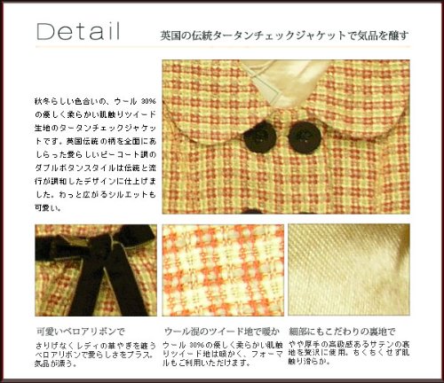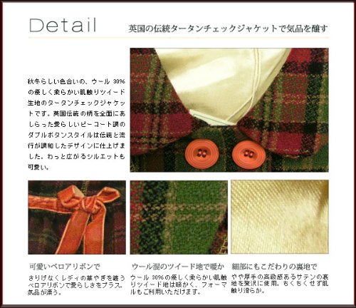 秋冬らしい色合いの、ウール30%の優しく柔らかい肌触りツイード生地のタータンチェックジャケットです。英国伝統の柄を全面にあしらった愛らしいピーコート調のダブルボタンスタイルは伝統と流行が調和したデザインに仕上げました。秋から冬の始めまでお召しいただけます。英国調のかわいいチェック柄で気品が漂う。短丈の細めデザインで足長効果アップ。フォーマルとしてもご利用いただけます。 素材:表地:ウール30%、ポリエステル70% 裏地:ポリエステル100%です。