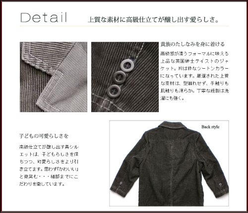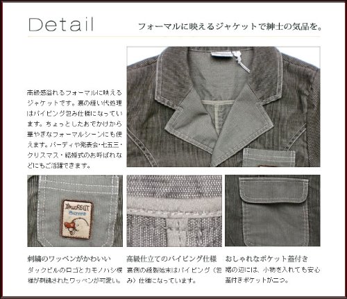 子供服男の子用、今冬流行テイストのコーデュロイジャケットです。よくあるきちんとしたスーツでなく普段でも着れるタイプ。 子供服ブランドのこだわり上質な綿素材を使用。しっかりと厚手の生地でとっても暖か。胸のポケットにあるダックビルのロゴもシンプルでかっこいい。 裾のポケットにはフタがついているので小物を入れても安心。子供服ですが、高級紳士服と同じの仕立て。可愛い正統派の子供服、アドゥラブルの英国風紳士スタイル代表です。秋冬物。素材:コットン100%です。