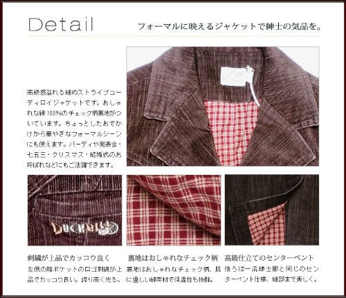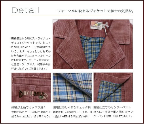 今冬流行テイストの子供服ブランドコーデュロイジャケット。子供服ブランドのこだわり上質な綿素材を使用。子供服ですが、高級紳士服と同じの仕立て。 表地はしっかりと厚手の生地でとっても暖か。裏地にはカラフルなチェック柄のコットン生地を使用しています。コーデュロイの毛下の生地に薄茶っぽい色が付いているので、角度によってはダメージ加工に見えてカッコイイですよ。 胸のポケットにあるダックビルのロゴもシンプルでかっこいい。秋冬物。素材:表地:コットン100%で、 裏地:コットン100%です。